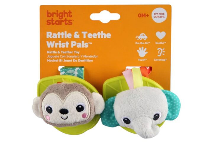 Estos sonajeros de muñeca portátiles de Bright Starts harán las delicias de su bebé con cada movimiento de baile y movimientos de manos. Los alegres juguetes de pulsera vienen con personajes de elefantes y monos que le encantarán a tu pequeño. Durante el incómodo momento de la dentición, la hoja de silicona verde sin BPA brinda comodidad y alivio.